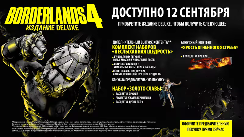 Оформите предварительную покупку Borderlands 4 и получите набор «Золото славы», включающий расцветки Искателя Хранилища, оружия и дрона ЭХО-4!*